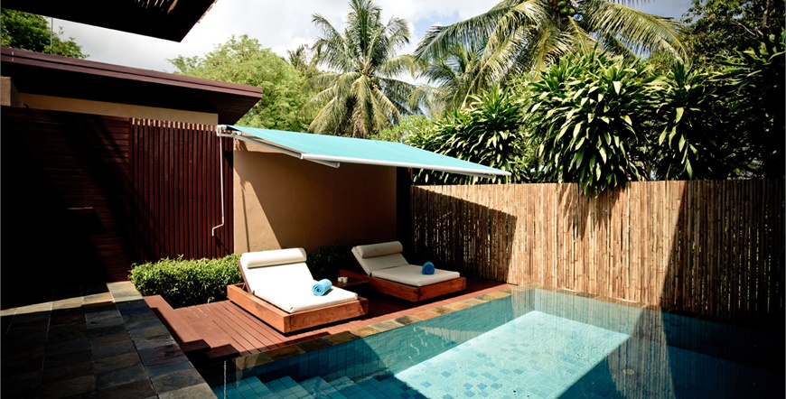Pool Villa, cca 165 m2 (cca 77 m2 stambeni prostor): kombinirani dnevni boravak / spavaći prostor i prostrani vanjski prostor s natkrivenom terasom sa ležaljkama, suncobranom i tušem za vanjski vodopad i privatnim bazenom (cca 5,5 x 4 m)