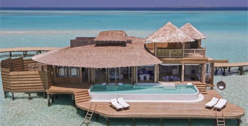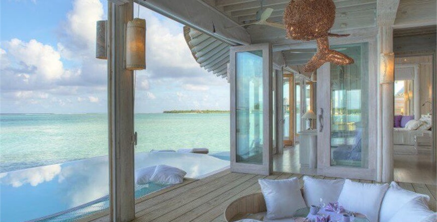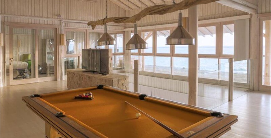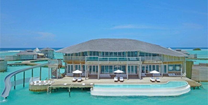 One Bedroom Water Retreat , cca 411 m2, bazen cca 13x 4 m, 1 spavaća soba u prizemlju, dnevniboravak na katu s potopljenim trpezarijskim stolom na staklenoj ploči, vanjskituš. Moguće je također rezervirati s vodenim toboganom.