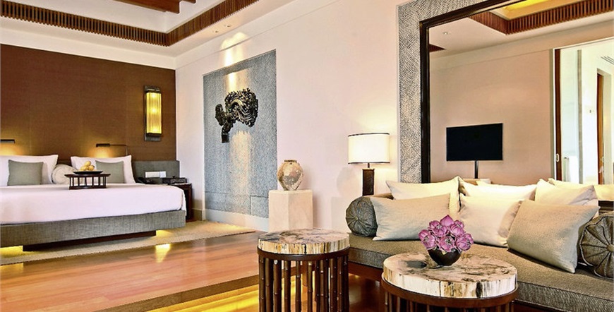 -Premier Sea View (24) oko 70 četvornih metara: na nižim katovima zgrade hotela. Prostrani apartman s optički odvojenim dnevnim / spavaćim djelom, samostojećom kadom i balkonom s pogledom na Panwa zaljev.