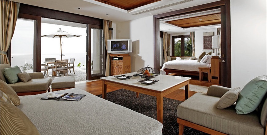 -Two Bedroom Ocean Front Pool Villa (2) cca 300 metara kvadratnih: Kao i Ocean Front Pool Villa, oko osam metara iznad uvale sa 2 spavaće sobe, 2 kupaonice, odvojenim dnevnim boravkom / blagovaonicom, kuhinjom i sunčalištem, vanjskim tušem, bazenom (ca 10 m.) i pogledom na more.