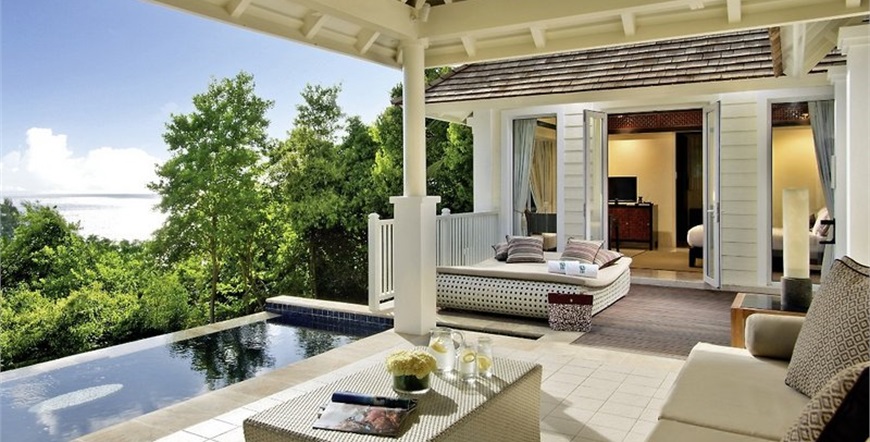 -Intendance Pool Villa: cca 107 m² (otvoreni prostor sa paviljonom 68 metara kvadratnih) (4), kao što su Oceanview Pool Villa , osim toga s vanjskom kadom i jacuzzijem, integrirana u prirodi i izgrađena na granitnim stijenama.