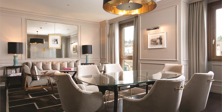Portret Firenze sadrži 37 luksuznih soba i apartmana u Firenci, uključujući i spektakularan krovni suite i 273metara kvadratni Penthouse Kat. U vlasništvu je obitelji Ferragamo i uvršten među Hotela vodećih u svijetu. Firentinski arhitekt Michele Bonan dao je hotelu prepoznatljivu arhitekturu, lokaciju pored rijeke pored Ponte Vecchio-a sa jedinstvenim stilom i baštinom. Voda rijeke Arno i stari svijet Ponte Vecchio-a uokvireni su u dnevnom boravku i spavaćoj sobi u prozoru, ogledalo stvara osjećaj prošlosti i sadašnjosti u dizajnu interijera.Klasični i suvremeni namještaj kao toplo drvo i ne-prozirna siva boja kupaju se u sjaju pozlaćenih detalja i ljeskanju čelika. Mekani materijali i udobni kašmir postavljaju aristokratski opuštajući ton. Svaki raskošan luksuzni apartman ima svoj vlastiti identitet i mnoge osobine koje caruju i čine apartman savršenim iza pozornice na firentinskom filmskom setu.