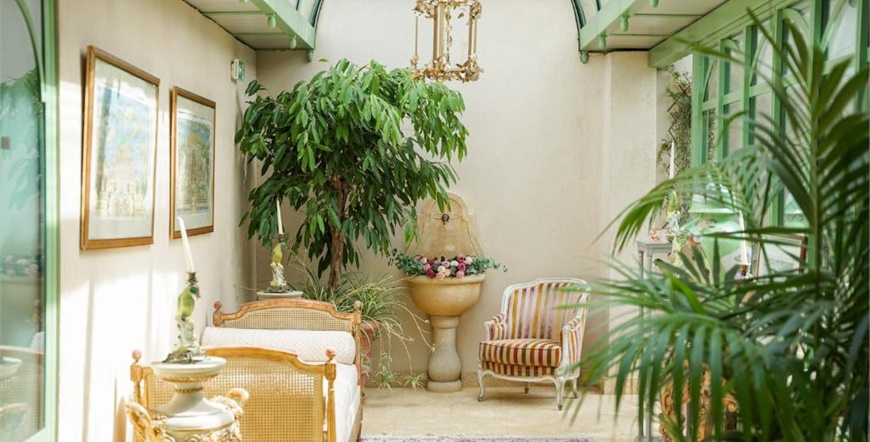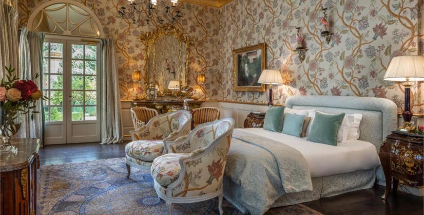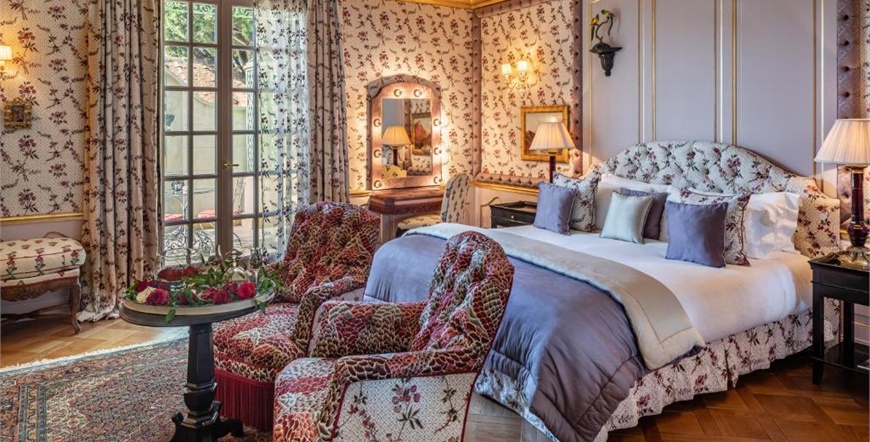 Hotel raspolaže s otprilike 22–23 luksuzno uređenih soba i suiteova, svaka individualno dekorirana u Louis XV stilu, u toplim nijansama i luksuznim tkaninama. Većina ima vrtni izlaz, balkon ili terasu kao produljeni dio prirodnog okruženja.